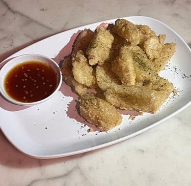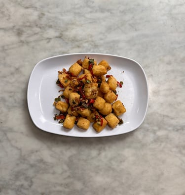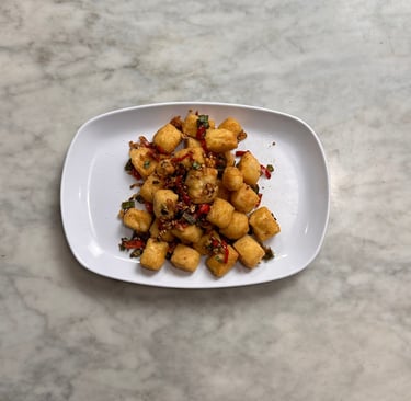 Tahu goreng dengan rasa gurih dan sentuhan pedas ringan.