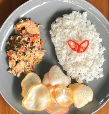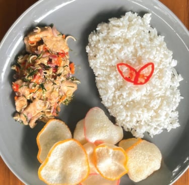 Nasi hangat dengan ayam sambal matah yang segar dan pedas.