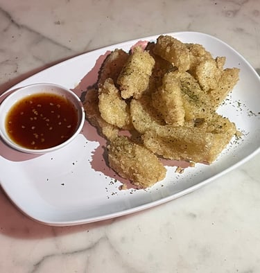 Cireng renyah dengan saus rujak yang segar dan pedas manis.